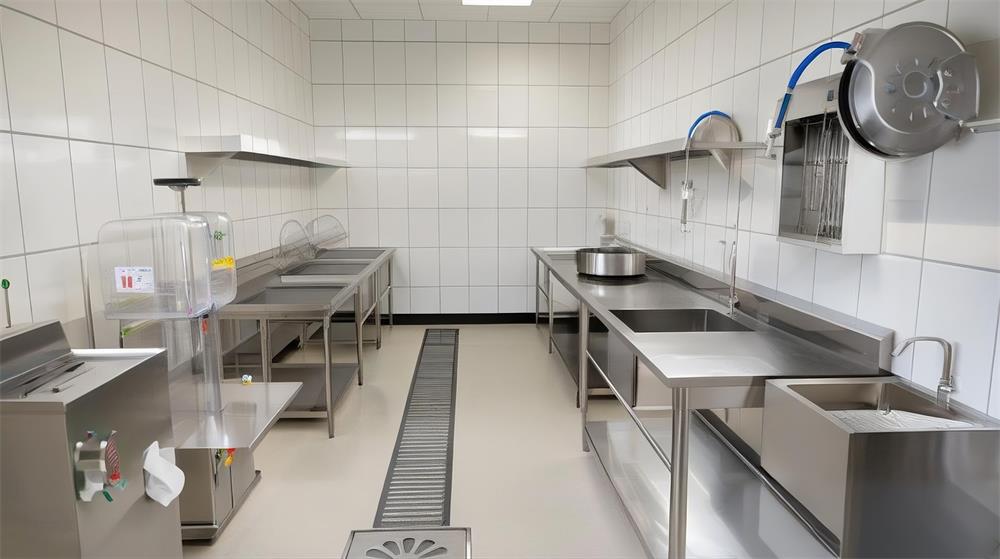 -地面和墻面使用防滑、易清潔、耐用的材料,如防滑瓷磚和不銹鋼墻面。